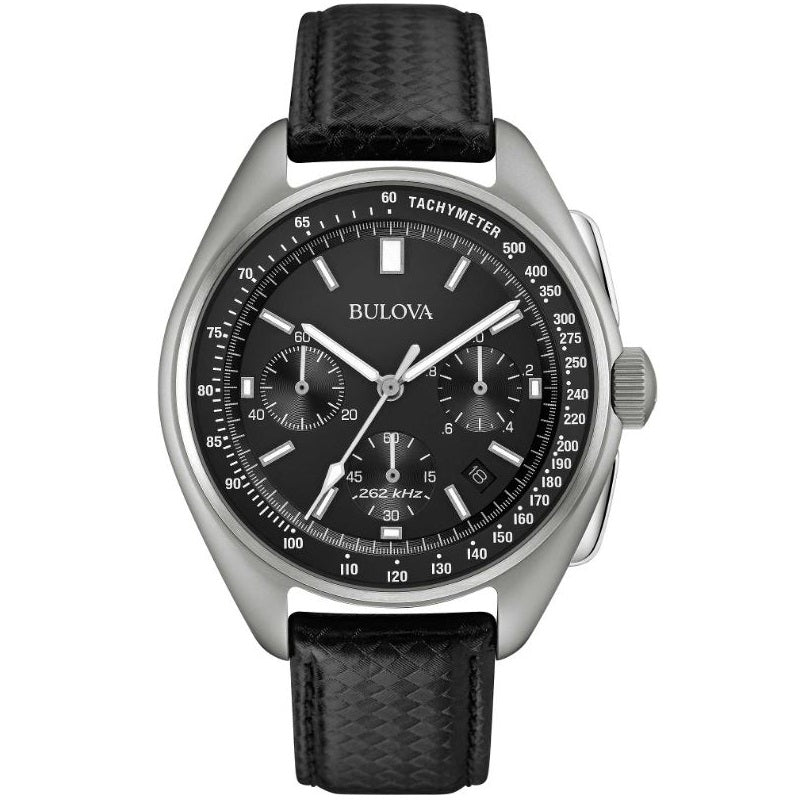 Bulova Lunar Pilot Bulova Special Edition men's chronograph watch. Black sapphire crystal dial with steel hands and indexes, and stainless steel case.