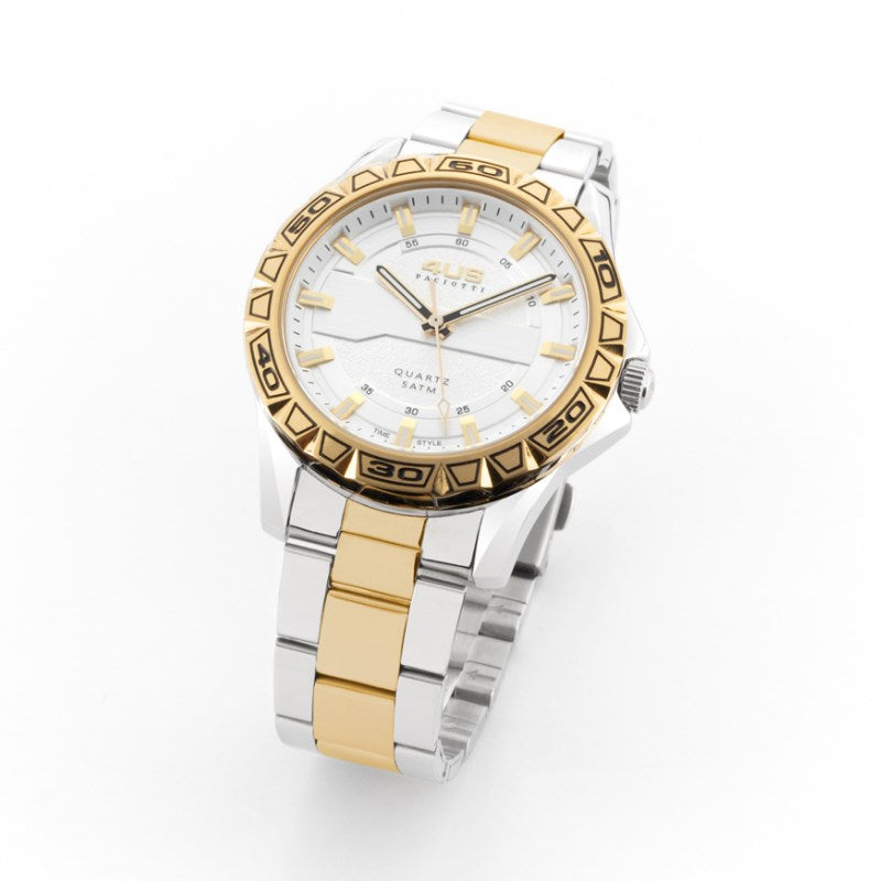 Cesare Paciotti men's watch. Time-only watch with Miyota quartz movement. 5 atm water resistance with luminous indexes. Round-shaped steel case with a diameter of 40 mm. White dial and steel and gold strap. Closure: deployant.