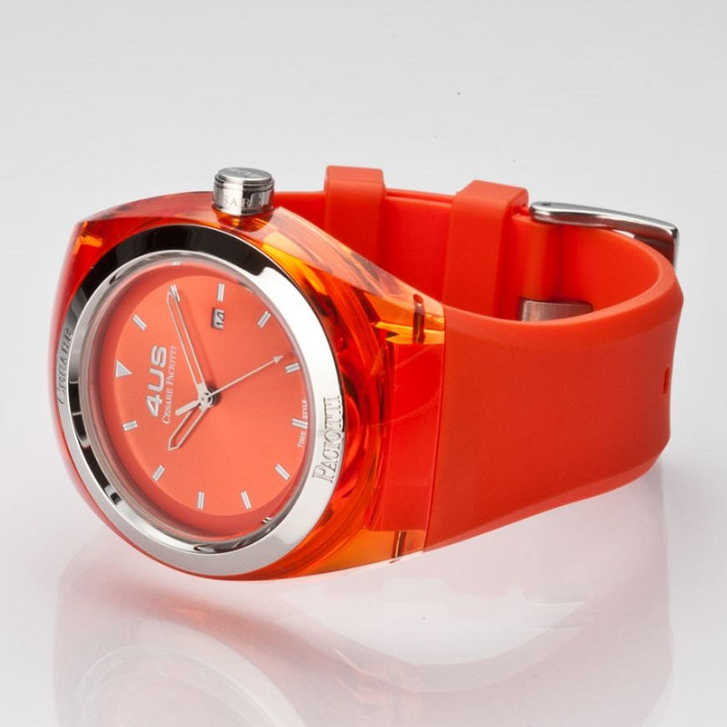 Cesare Paciotti 4US unisex time only watch. Steel case, diameter 45mm. Orange dial color. Orange silicone strap. Quartz movement. Water resistance 100m.