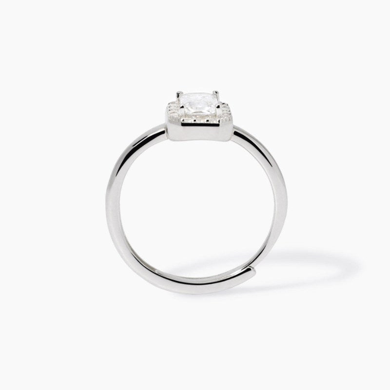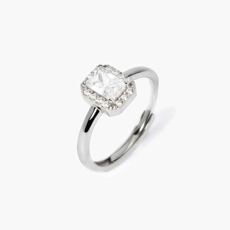 Anello regolabile da donna in argento rodiato con zircone centrale taglio ottagonale e zirconi bianchi. Dimensione zircone ottagonale: 7x9. Dimensione zirconi baguette: 4x6. Diametro zirconi: 1,25. Misura regolabile da 9 a 17 cm. Materiale: Argento 925, Zirconi.