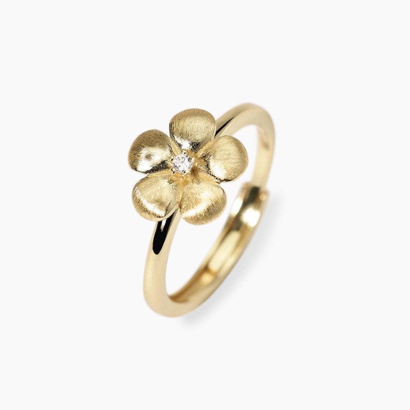 Anello regolabile con fiore in argento bulinato placcato oro 18K e zircone bianco.