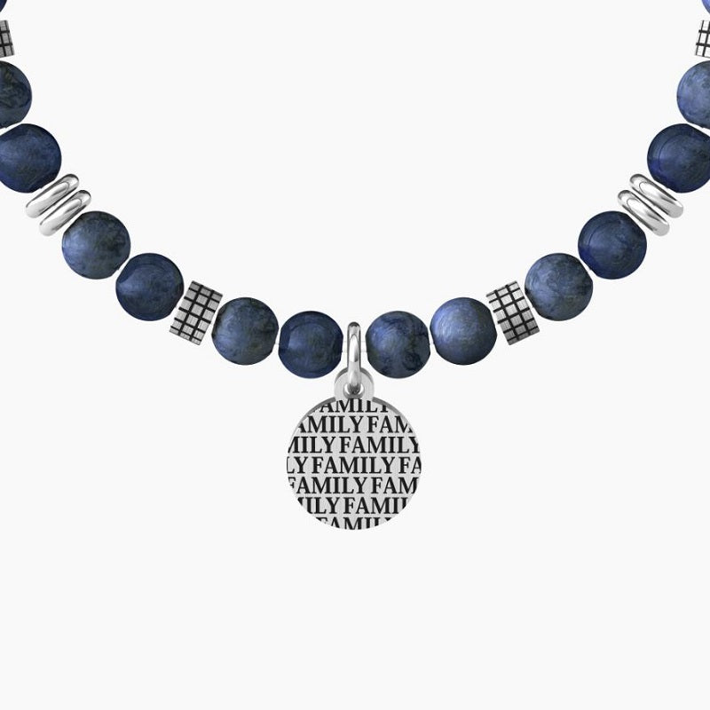 Pulsera elástica de acero con cilindros y anillos alternados con esferas de dumortierita azul, con colgante redondo negro. Colección Familiar.Diámetro del colgante: 12 mm.Diámetro de la bola: 6 mm.Talla única, largo 20,5 cm.Material: Acero 316L con PVD negro, Dumortierita azul.