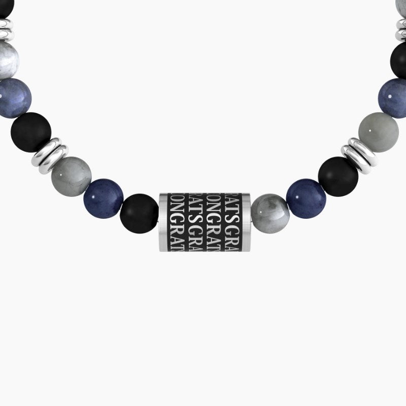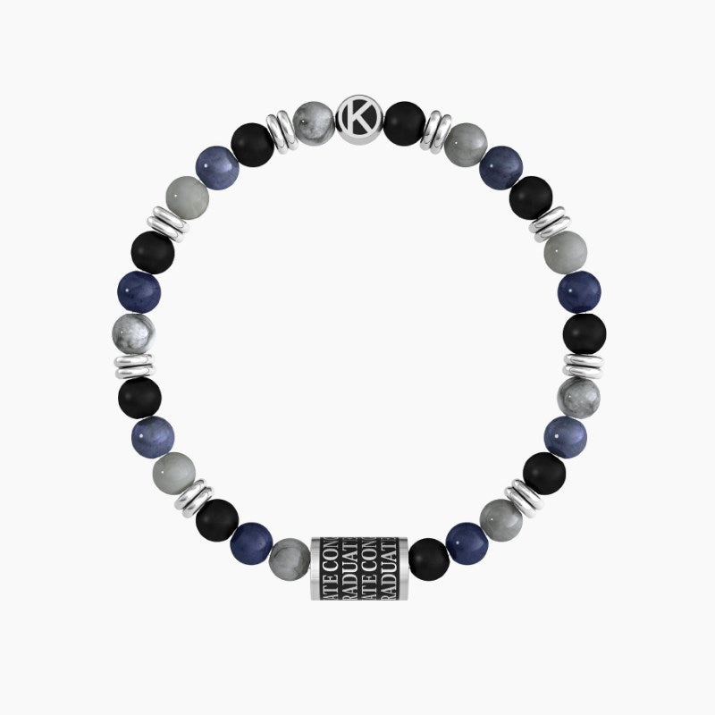 Pulsera elástica con piedras multicolores y charm de acero con escritura "Felicidades graduado". Colección Momentos Especiales. Talla única, largo 19,50 - 19,80 cm. Diámetro de la bola: 6 mm. Dimensiones del dije: 13x8,50 mm. Materiales: acero 316L con PVD negro, piedras multicolor.