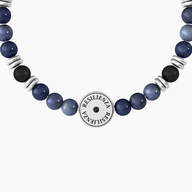 Pulsera elástica para hombre de acero con dumortierita azul, ágata negra y elemento de PVD negro satinado con tortuga, cristal negro y escritura "Resilienza". Colección de símbolos. Diámetro de la piedra: 6 mm. Diámetro del elemento: 12 mm. Diámetro del cristal: 1,75 mm. Talla única, circunferencia 20 cm. Material: Acero 316L, Dumortierita azul, Ágata negra, PVD negro, Cristales