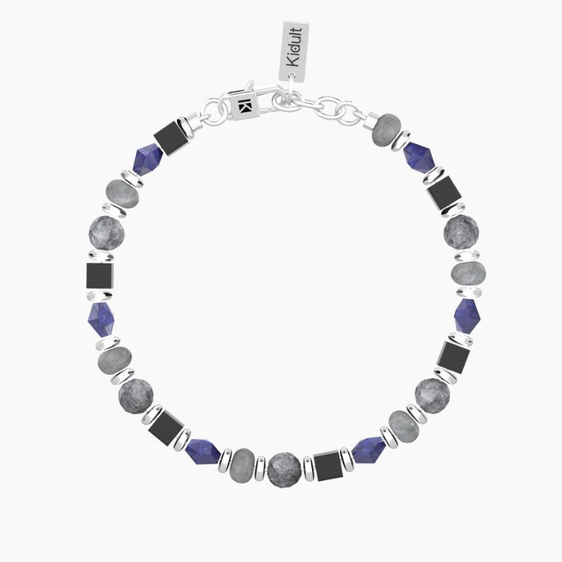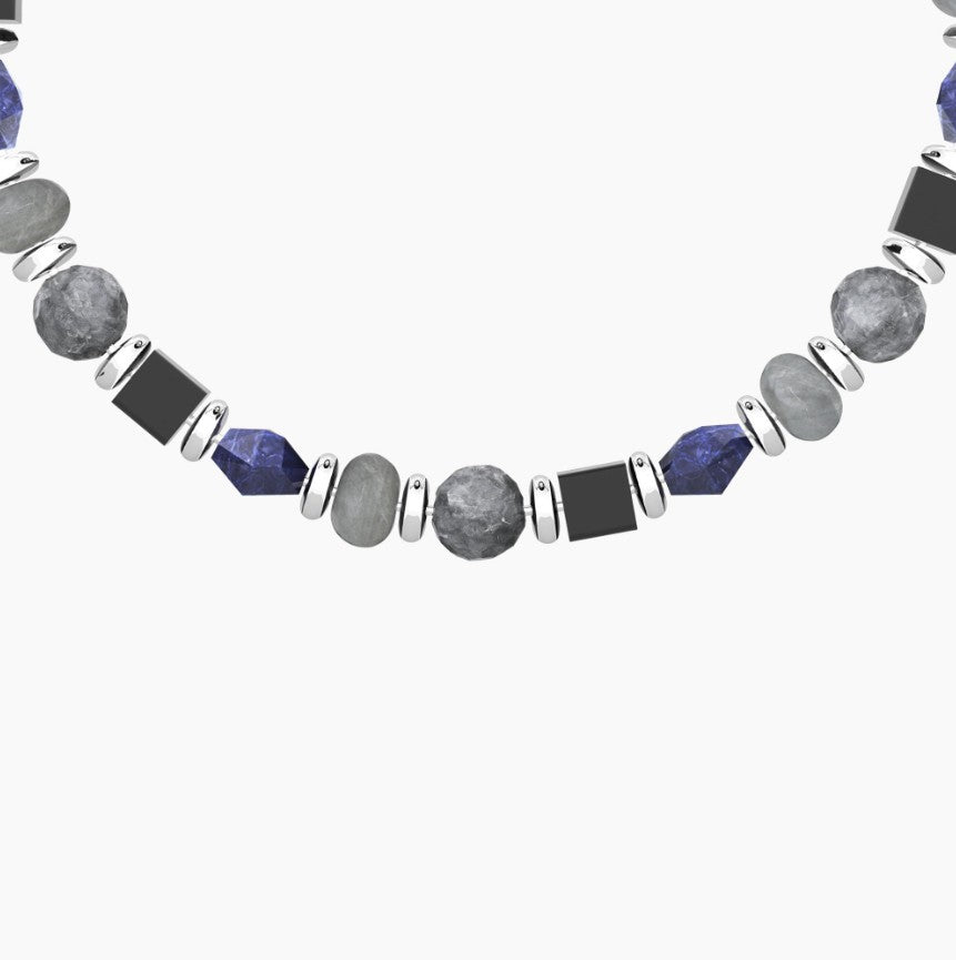 Bracciale regolabile da uomo in acciaio con sodalite blu, agata nera e grigia lisce e faccettate di diverse forme. Collezione Energy Stone. Dimensione delle pietre: 6x6, Ø 6 mm, 4xØ6 mm. Misura regolabile, lunghezza da 19 a 21 cm. Materiale Acciaio 316L, Agata, Sodalite blu. Immagine indicativa in quanto trattandosi di pietre naturali i colori del bracciale potrebbero variare.