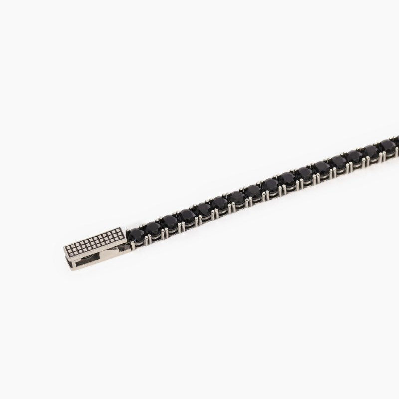 Pulsera tenis de plata bruñida con circonitas negras. Engaste de las circonitas con puntas de cuatro puntas. Diámetro circonita: 3,50 mm. Cierre de clip con textura de espiga. Tamaño pequeño, largo 19 cm. Tamaño mediano, largo 20 cm. Material: Plata 925, Circonitas.