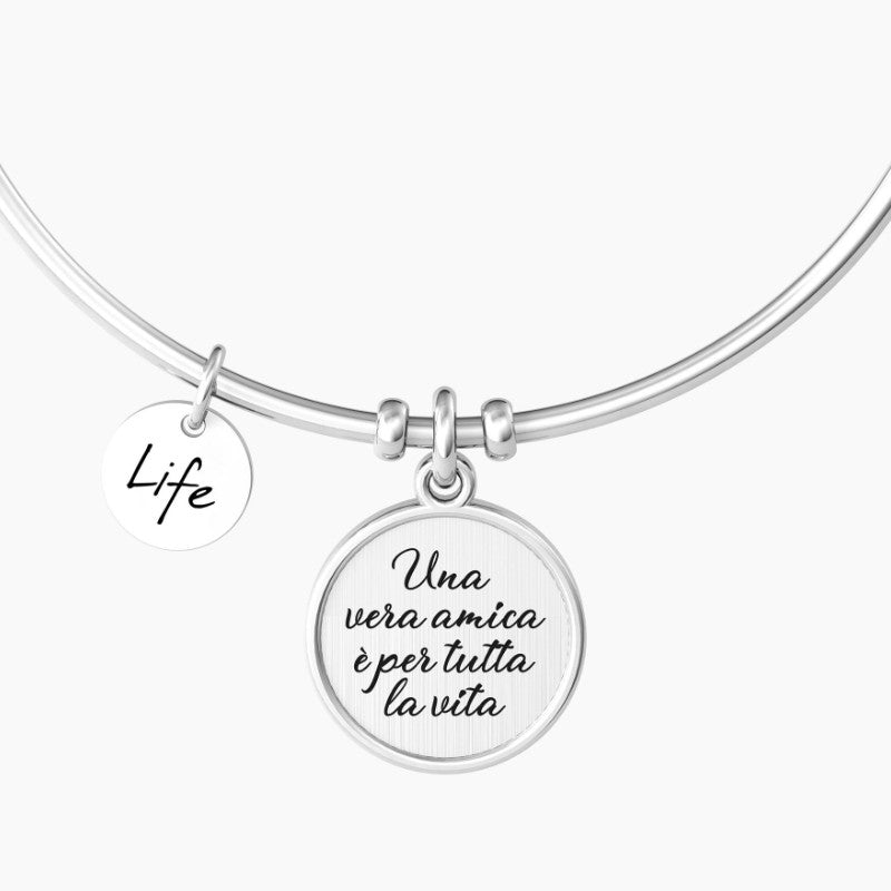 Brazalete de acero con colgante redondo con borde brillante, cristal blanco y frase "Un verdadero amigo es para toda la vida". Talla única, diámetro 20 cm. Diámetro del colgante redondo grande: 6 cm. Diámetro del colgante redondo pequeño: 18 mm. Diámetro del cristal: 1,75 mm. Cierre redondo. Materiales: acero 316L, cristal blanco