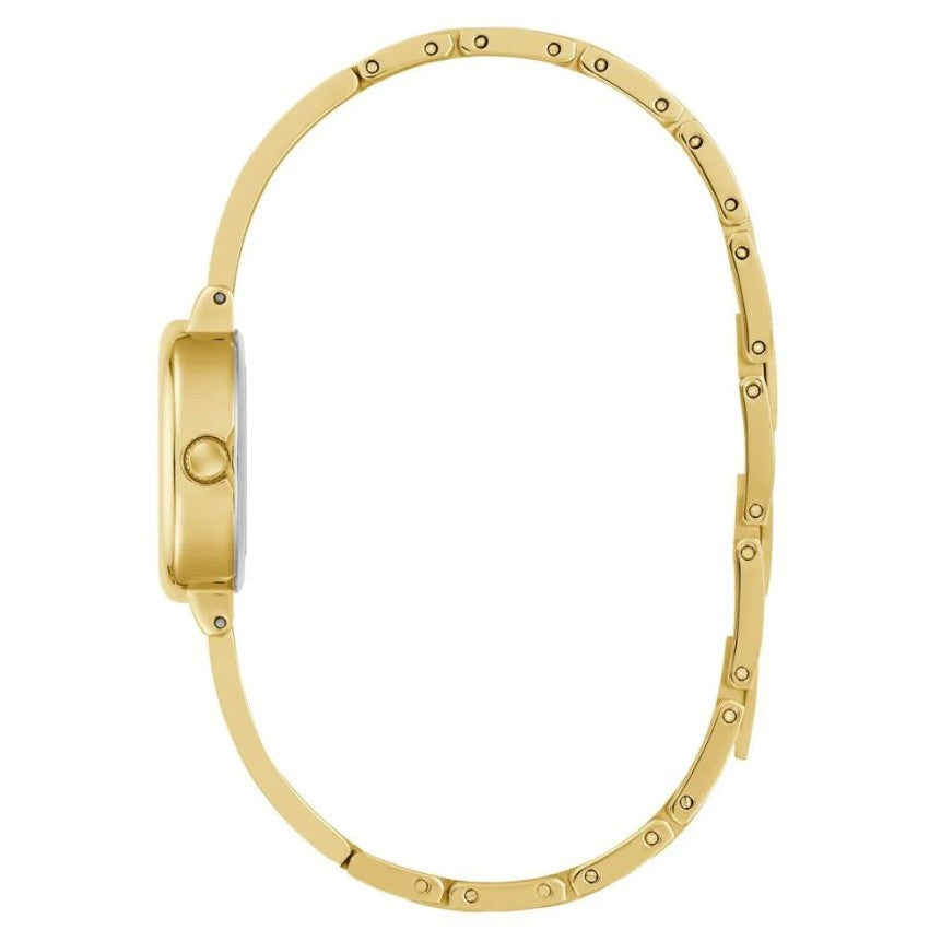 Orologio da donna Guess della collezione Penelope. Cassa ovale in acciaio riciclato con finitura lucida di colore oro. Diametro di 20.5x24 mm. Quadrante champagne. Vetro di minerale piatto. Cinturino in acciaio riciclato con finitura lucida di colore oro con chiusura G-Link. La larghezza delle anse è di 6 mm. Il movimento è 3H. La resistenza all'acqua è di 10 ATM.