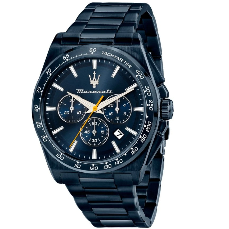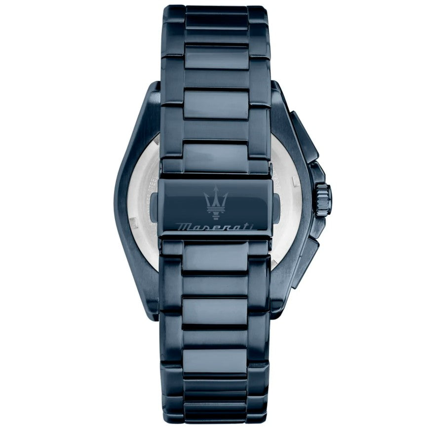 Orologio cronografo da Uomo Maserati della collezione Velocità Blue Edition. Movimento al quarzo, cassa 45 mm in acciaio inox PVD blue, lunetta con scala tachimetrica, spessore della cassa 11.90 mm, quadrante analogico blu, datario con finestrella tra ore 4 e 5, indici e lancette con inserto luminescente in modo che l'ora sia leggibile anche in condizioni di scarsa illuminazione, corona e fondello serrati a vite per una maggiore garanzia di impermeabilità e vetro minerale antigraffio. Cinturino è in acciaio inox PVD blue finitura lucida e satinata e monta una chiusura deployante con apertura a doppio pulsante. Orologio impermeabile a 10 ATM.