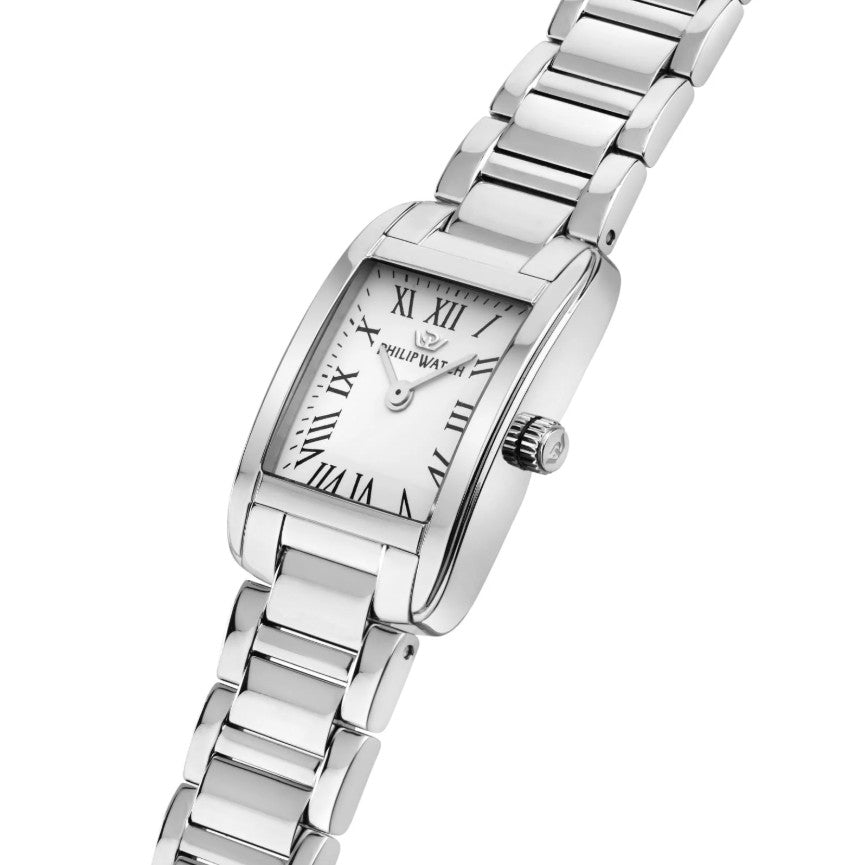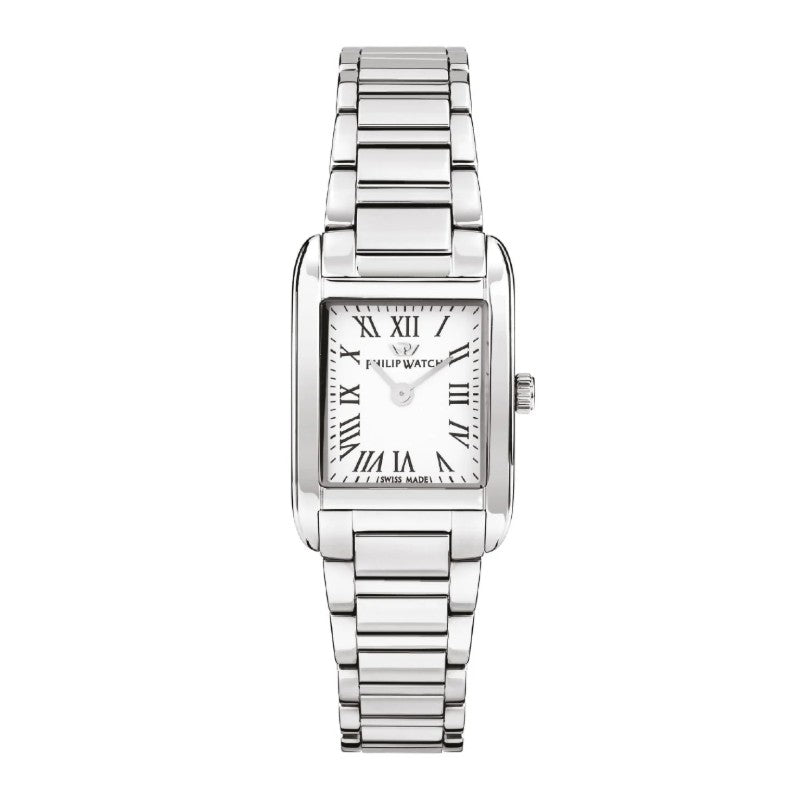 Orologio solo tempo da donna Philip Watch collezione Museum. Colore cassa: argento; colore del quadrante: bianco; colore del bracciale: argento. Cassa squadrata di dimensioni 31 x 21,5 mm in acciaio inossidabile 316L. Vetro zaffiro curvato. Bracciale in acciaio inossidabile 316L con chiusura deployante. Movimento al quarzo. Classificazione di impermeabilità (WR) 3 bar: resistente agli schizzi d’acqua ed alla pioggia, ma non sotto pressione. Swiss made.