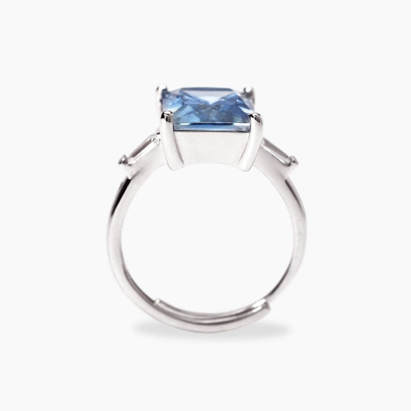 Anello regolabile in argento rodiato con acquamarina sintetica taglio baguette e zirconi bianchi laterali taglio taper. Dimensione acquamarina sintetica: 9x11 mm. Dimensione zirconi: 4,25x2,5 mm. Misura regolabile, taglia dalla 11 alla 19. Materiale: Argento 925, Zirconi, Acquamarina sintetica.