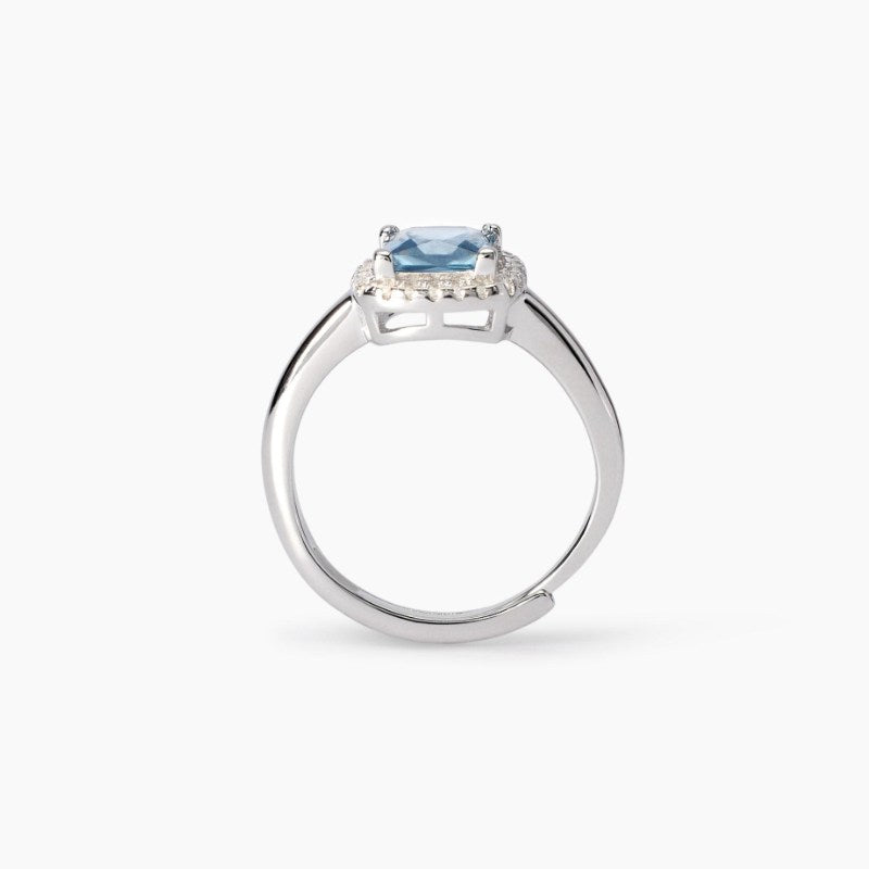 Anello regolabile in argento taglio princess con acquamarina sintetica e zirconi bianchi. Dimensione acquamarina sintetica: 6x6 mm. Diametro zirconi: 1 mm. Misura regolabile dalla 11 alla 19 cm. Materiale: Argento rodiato 925, Zirconi, Acquamarina sintetica.