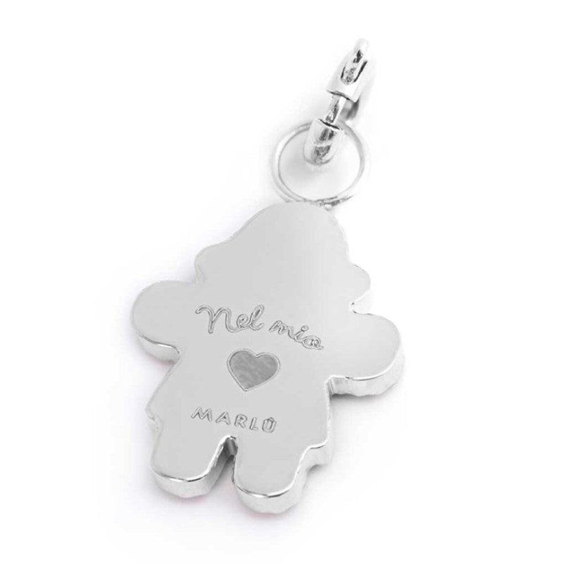Charm a forma di bimba, nella parte anteriore sono presenti cristalli bianchi. Sul retro è laserata la scritta "Nel mio", un cuore e il logo Marlù.